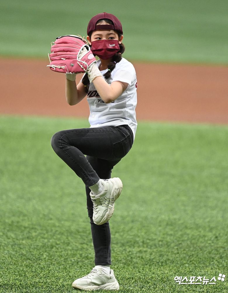 [엑스포츠뉴스 고척, 김한준 기자] 5일 오후 서울 구로구 고척스카이돔에서 열린 '2021 신한은행 SOL KBO리그' KT 위즈와 키움 히어로즈의 경기, 경기 전 가수 임서원이 시구에 임하고 있다.