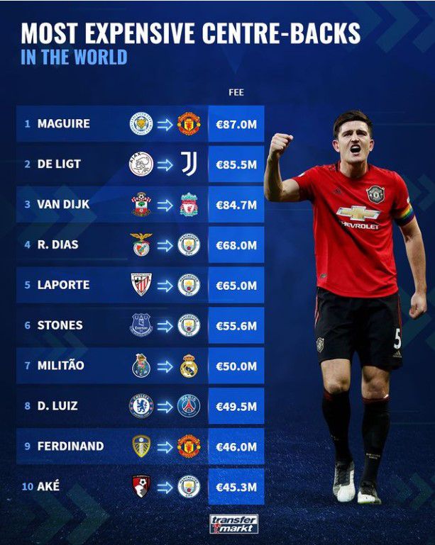 축구 이적 시장 매체 '트랜스퍼 마켓'은 최근 역대 가장 비싼 몸값을 자랑했던 센터백 순위를 공개했다.