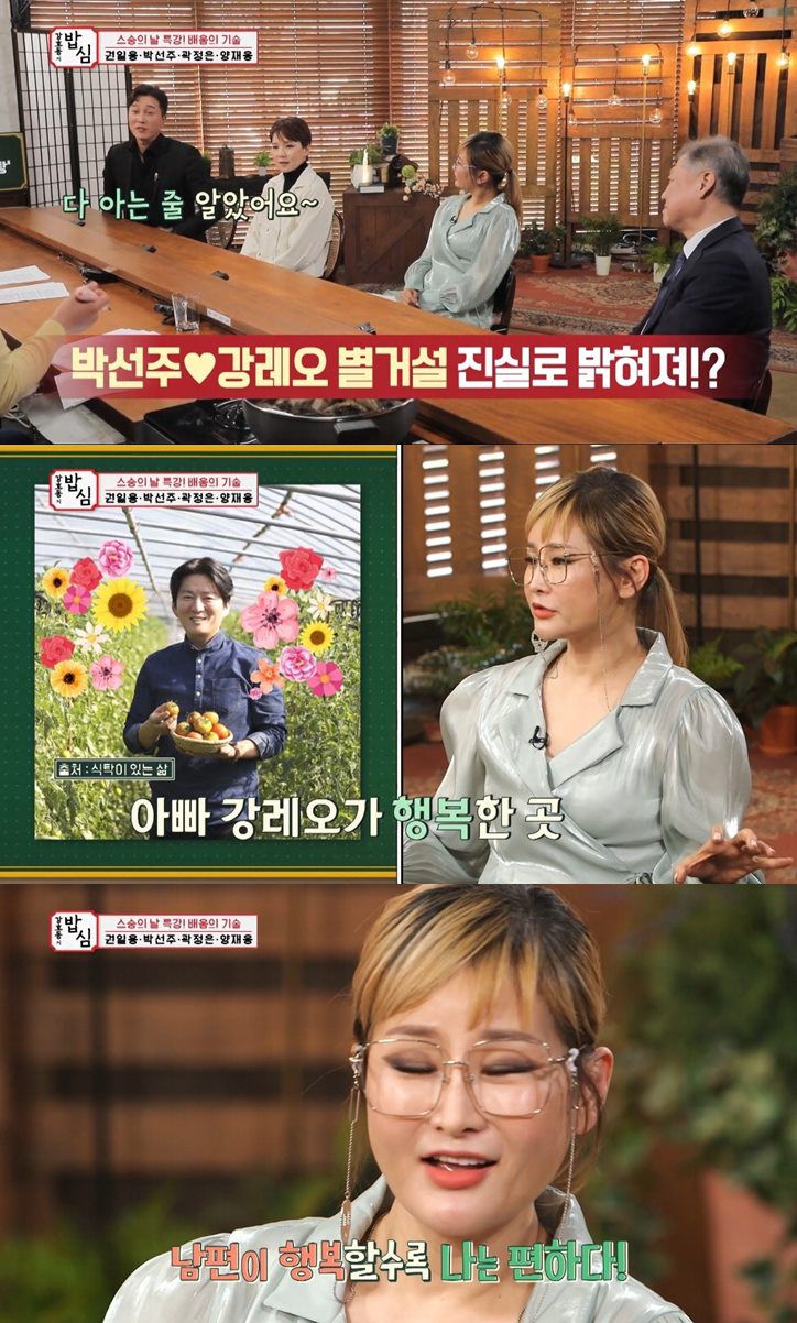 이날 박선주는 남편 강레오와의 별거설에 대해 해명했다. 그는 "강레오 씨는 원래 꿈이 농부다. 요리 공부를 하긴 했지만 농사를 본격적으로 짓기 시작한지 4~5년차가 됐다. 일주일을 계속 돌아다니면서 산다. 그 생활을 시작한지가 3년이 됐다"고 운을 뗐다.