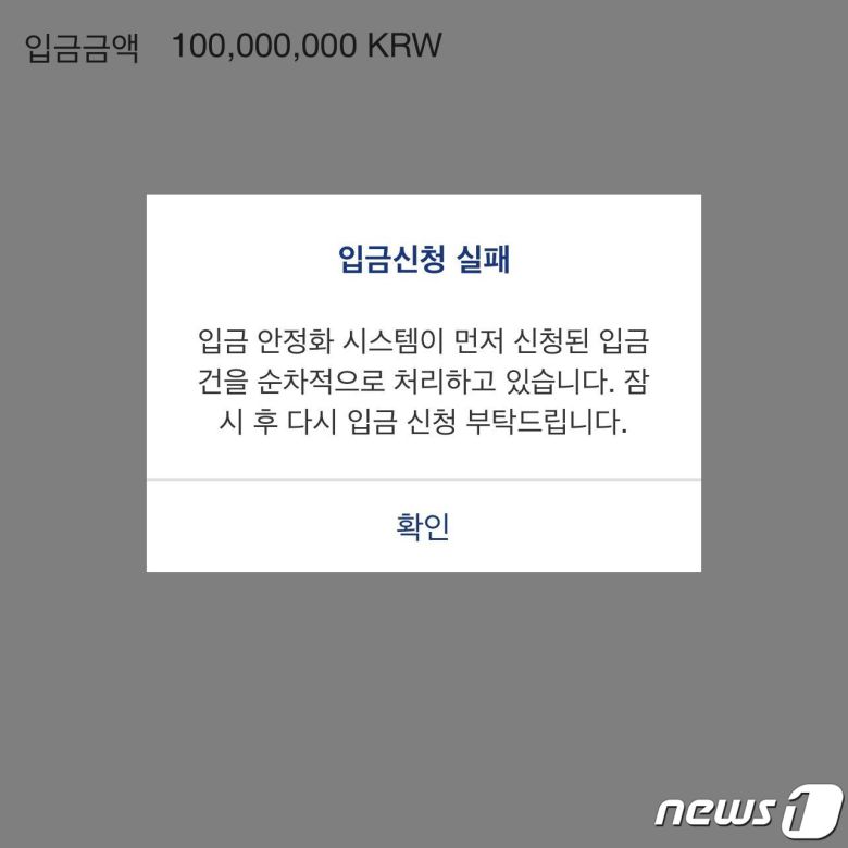 13일 업계에 따르면 오전 9시 전후로 업비트에서는 입금 지연 현상이 속출했다. 입금을 신청하면 입금신청 실패 메시지가 뜨면서 "입금 안정화 시스템이 먼저 신청된 입금 건을 순차적으로 처리하고 있습니다. 잠시 후 다시 입금 신청 부탁드립니다"라는 내용이 안내되는 식이다. 일부 투자자는 1시간 넘게 기다렸음에도 입금 처리가 되지 않았다고 항의했다.