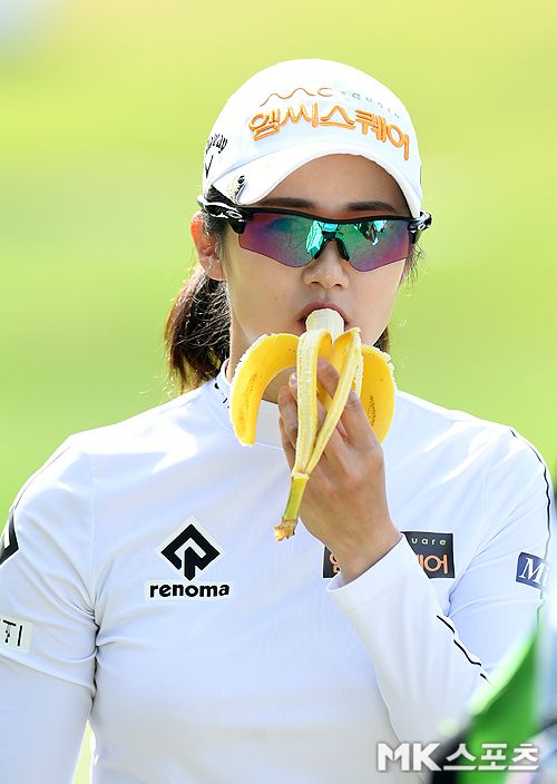 이세희가 18번홀 그린을 마치고 바나나를 먹고 있다.
