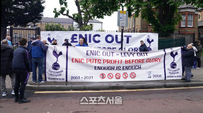 수백명의 토트넘 팬들은 15일(현지시각) 영국 런던의 토트넘 홈구장 홋스퍼스타디움 주변에 모여들어 ‘ENIC 아웃, 레비 아웃’ 등의 플래카드를 경기장 곳곳에 내걸었다. 서포터스는 토트넘의 정상화를 위해 비상 모임을 갖자는 제의를 레비 회장이 거절했다고 비난했다.