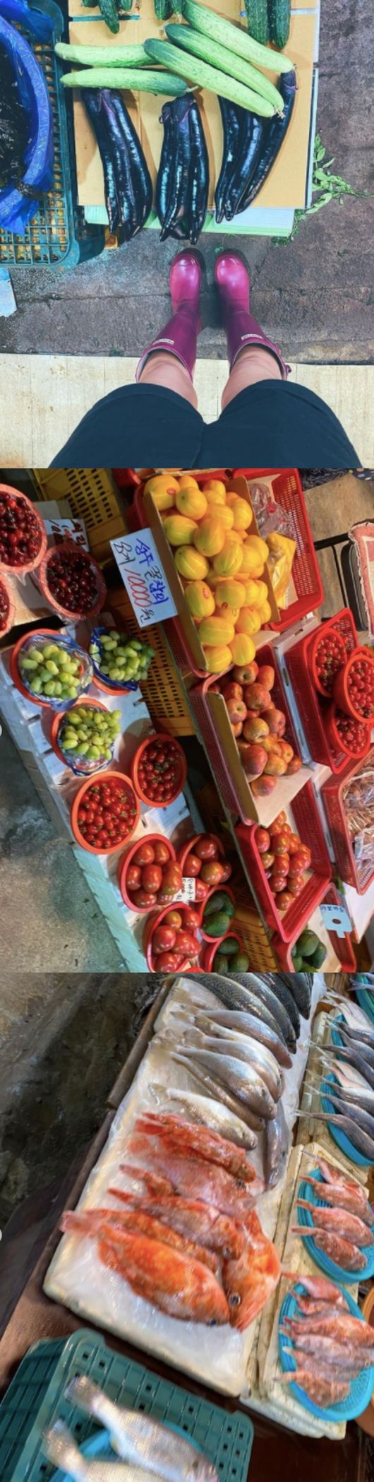 함께 공개된 사진 속에는 장화를 신고 장을 나온 진재영의 다리와 과일, 생선 등 여러 물품들로 활기 넘치는 시장의 모습이 담겨져 있다.