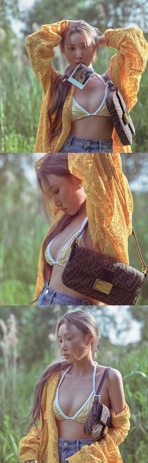 공개된 사진 속 화사는 비키니와 청바지를 매치해 패셔니스타다운 스타일링을 자랑했다.