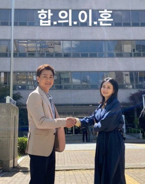 공개된 사진 속 최정윤은 법원 앞에서 배우 박형준과 악수하고 있다. ‘합의이혼’은 드라마 ‘아모르파티’ 내용이었던 것.