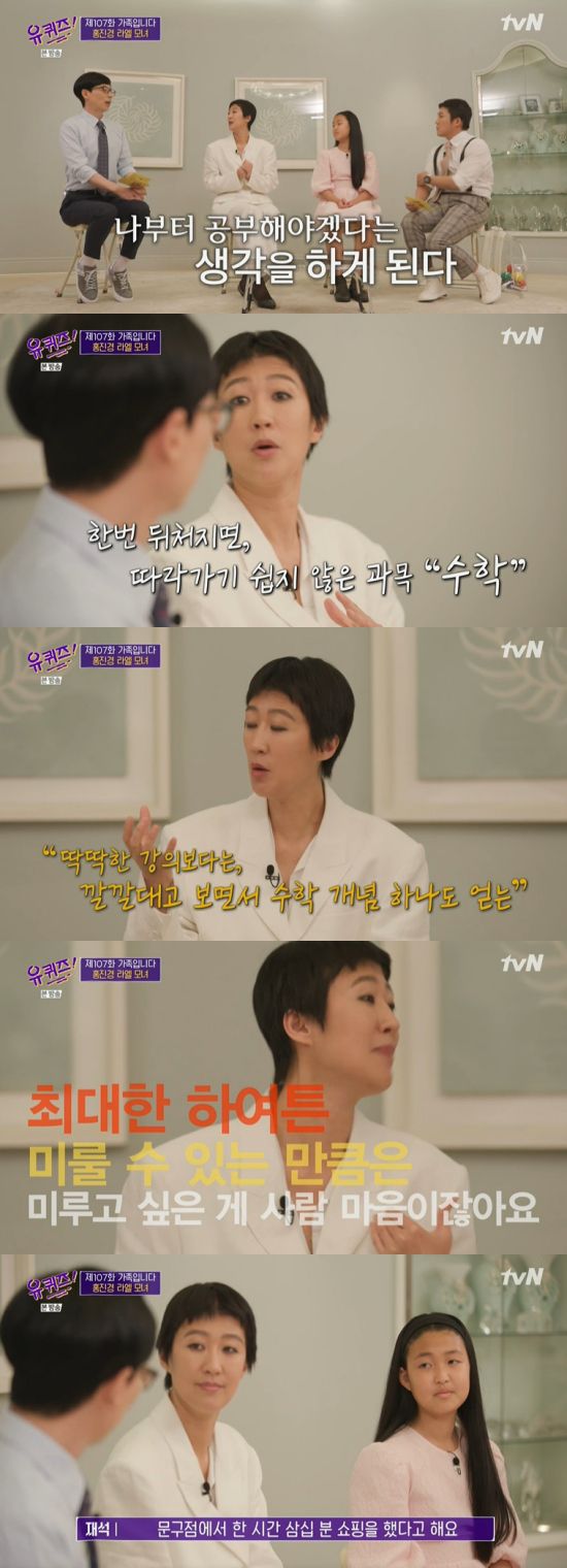 이날 유재석은 "요즘 화제인 공부 유튜브를 하고 있지 않냐. 어떻게 만들게 된 거냐"라며 물었다. 홍진경은 "아이를 낳아서 기르다 보니까 얘가 공부할 때 뭔가 옆에서 도와주기도 하고 그래야 하는데 워낙 어린 나이에 방송 생활을 시작해서 의무 교육을 받아야 될 때를 놓친 게 있다. '내가 공부를 해서 가르쳐야겠구나'라는 생각이 들었다"라며 털어놨다.