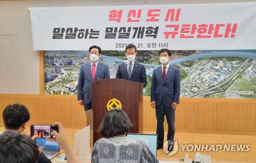 (진주=연합뉴스) 지성호 기자 = 경남 진주 출신 도의원 3명이 21일 진주시청 브리핑룸에서 'LH 진주 본사 분할 반대' 내용의 기자회견을 하고 있다. 2021.5.21