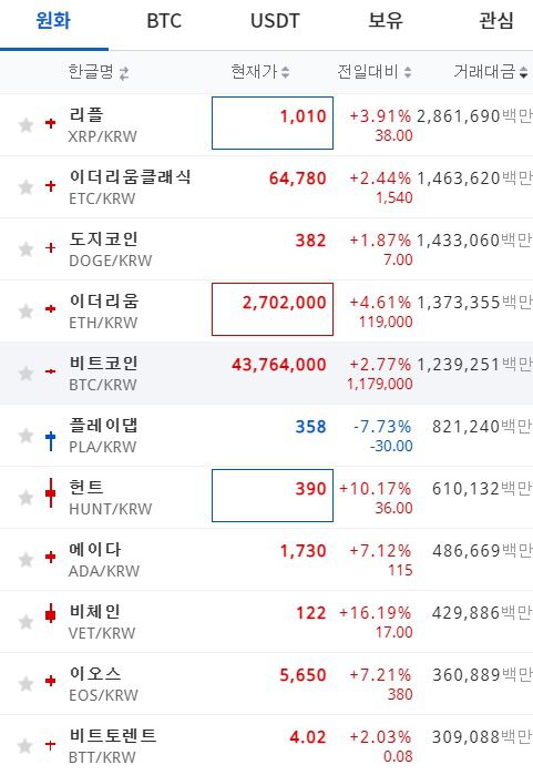 이더리움은 4.61%, 리플은 3.91%, 비트코인은 2.77%, 비트토렌트는 2.03% 올랐다.