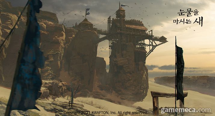 이에 크래프톤은 눈물을 마시는 새와 피를 마시는 새 IP를 활용한 게임 제작을 위해 비주얼 R&D 작업을 진행 중이다. 이번에 공개한 삽화 2점은 소설이 시작되는 남쪽의 마지막 주막과 나가족의 사모 페이를 태운 대호 마루나래다. 비주얼 R&D 결과물은 소설 세계관과 분위기를 게임 및 다양한 2차 창작물로 구현할 때 쓰일 기본 콘셉트 이미지가 된다.