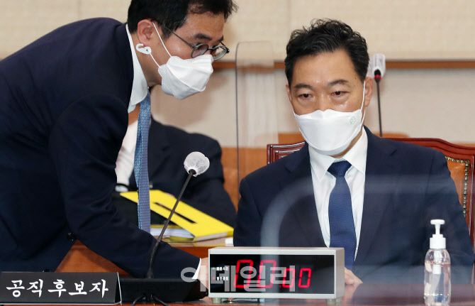 [이데일리 방인권 기자] 김오수 검찰총장 후보자가 26일 오전 서울 여의도 국회 법제사법위원회 회의장에서 열린 인사청문회에 출석해 관계자와 귀엣말을 나누고 있다. 이 기사의 카테고리는 언론사의 분류를 따릅니다.0공유하기