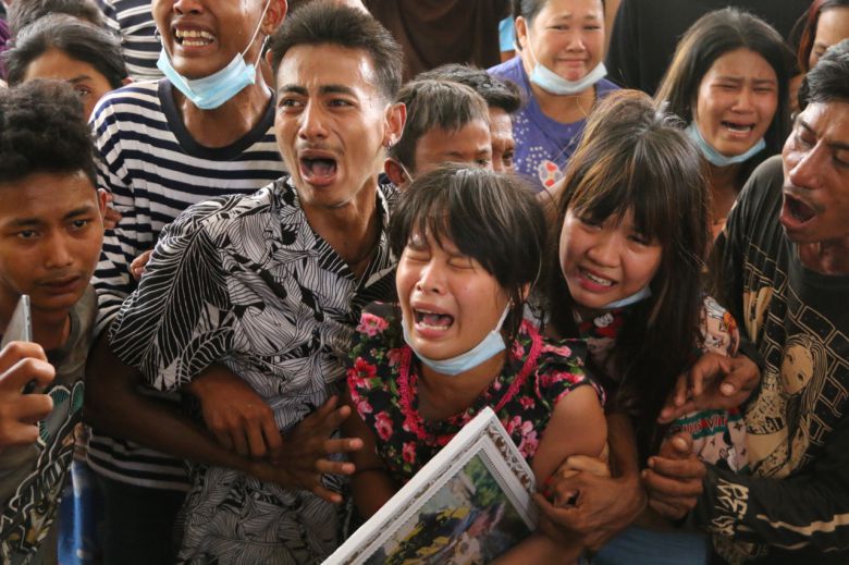 지난 4월 1일 미얀마 다웨이에서 군경의 총격에 목숨을 잃은 청년의 장례식에서 사망한 청년의 여자친구와 가족들이 울고 있는 모습. [EPA]
