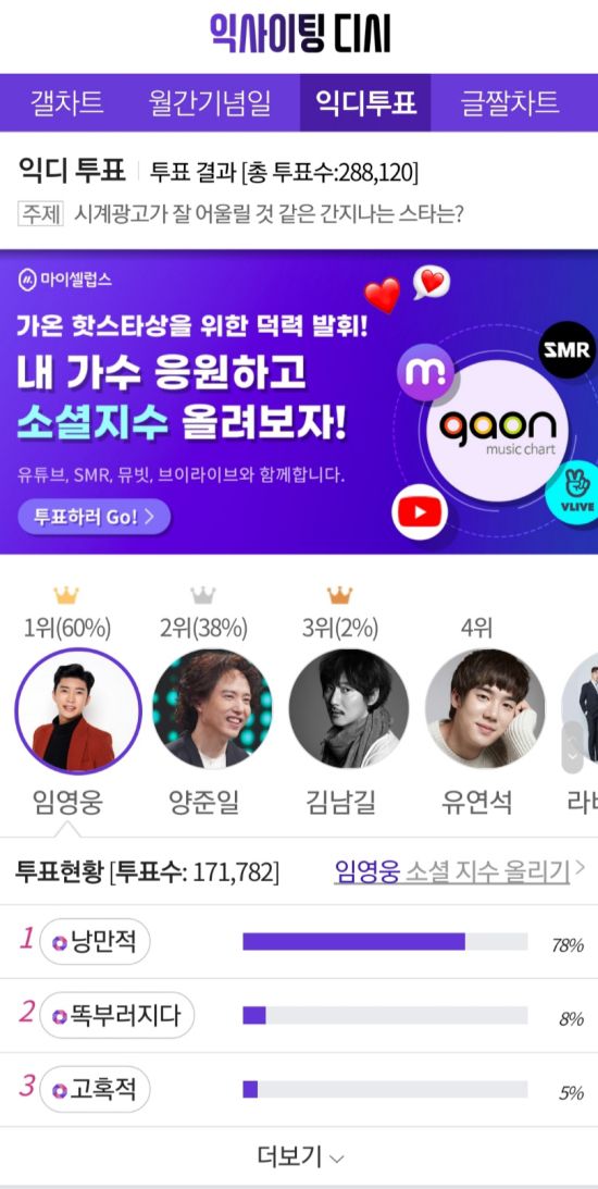 최근 커뮤니티 포털사이트 디시인사이드(대표 김유식)와 취향 검색 기업 마이셀럽스(대표 신지현)가 운영 중인 익사이팅디시에서는 “시계광고가 잘 어울릴 것 같은 스타” 랭킹 투표 결과가 공개됐다. 투표기간은 5월 23일부터 5월 29일까지였다.