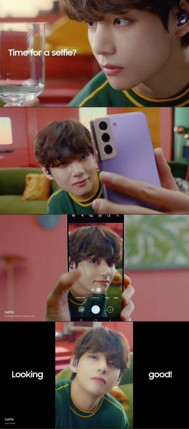 지난 29일 삼성 모바일 공식 트위터 계정을 통해 공개된 영상에서 뷔는 굴욕 없는 무결점의 완벽한 잘생김으로 광고의 흡입력을 높이며 큰 인기를 모았다.