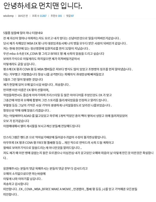 우선 mba 소속된 EK ,COVA 형 그리고 BFREE 형 께 사죄의 말씀을 드리고 싶습니다 보여주기식으로 이렇게라도 하지않으면 제가 미쳐버릴거같아서 이렇게라도 글을 남깁니다.