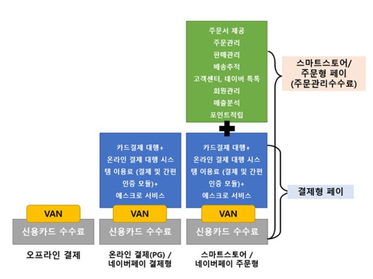 주문관리수수료를 결제 수수료로만 보면 안되고 온라인 상거래 비즈니스 전반을 위한통합 관리 수수료로 봐야한다는 의미다. 현재 스마트스토어는 입점비나 판매 수수료, 별도 호스팅 비용 등을 따로 받지 않고 네이버페이 주문관리 수수료만 받고 있다. 현재 네이버페이 주문관리수수료(신용카드)는 가맹점 매출규모에 따라 2.0%(연 매출 3억원이하 영세)~3.4%(30억원 이상)를 받고 있다.