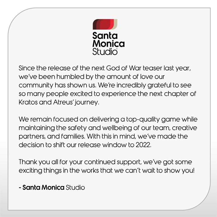 소니 산타모니카 스튜디오는 3일 자사 공식 트위터를 통해 갓 오브 워 신작 출시 연기 소식을 전했다. 산타모니카는 공식 성명을 통해 ‘작년에 갓 오브 워 신작을 발표했을 당시에 보여주신 엄청난 성원에 겸허함을 느꼈다. 많은 분들이 크레토스와 아트레우스의 다음 여정에 큰 관심을 보여주셔서 감사하다’라며 ‘제작팀과 크리에이티브 파트너 및 그 가족의 안전과 건강을 도모하면서도 완성도 높은 게임을 전해드리는데 집중하고 있다. 이에 출시를 2022년으로 연기하기로 결정했다’라고 전했다.