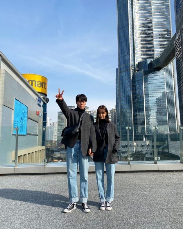사진 속 두 사람은 머리부터 발끝까지 한치의 오차도 없는 커플룩을 입고 있다. 손을 잡은 듯 잡지 않은 두 사람. 소멸 직전으로 작은 얼굴이 눈길을 끈다.
