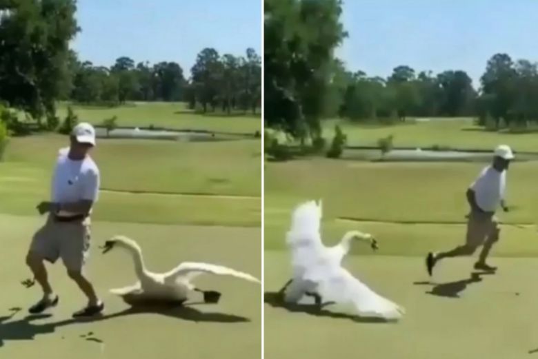 미국에서 '컵인'을 무사히 마친 골퍼가 백조의 공격을 받아 줄행랑치는 영상이 화제다.