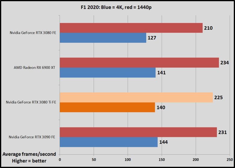 성공적인 레이싱 게임 가운데 가장 최근에 출시된 F1 2020은 다양한 그래픽 및 벤치마킹 옵션을 제공해 포르자(Forza) 시리즈보다 훨씬 더 신뢰할 수 있고 재미있는 옵션을 제공해 테스트하기 좋다. 이 게임은 DX 12 및 엔비디아의 DLSS 기술을 완벽하게 지원하는 코드마스터즈(Codemasters)의 부드럽고 매끄러운 에고(Ego) 게임 엔진의 최신 버전을 기반으로 한다. 호주 코스에서 두 바퀴를 테스트하는 데, 많은 하늘은 켜져 있고, DLSS는 끈 상태다.