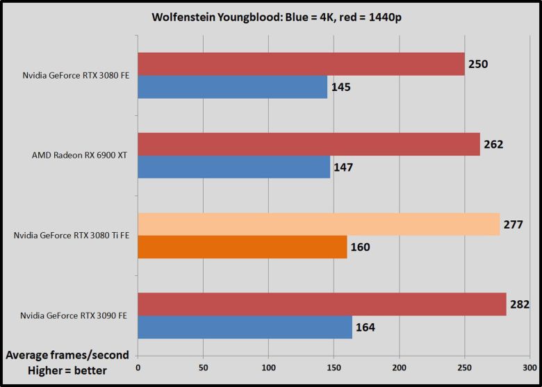 울펜슈타인: 영 블러드(Wolfenstein: Youngblood)는 친구와 협력해 협동 플레이를 할 수 있을 때 더 재미있지만, 이 게임은 과감한 실험작이자 완벽한 기술의 향연이다. 불칸 API에서 실행되는 영블러드는 놀라운 프레임 속도를 달성하며 레이 트레이싱, DLSS 2.0, HDR, GPU 컬링(GPU culling), 비동기 컴퓨팅, 엔비디아의 콘텐츠 어댑티브 쉐이딩(Content Adaptive Shading)과 같은 모든 종류의 최첨단 기술을 지원한다. 이 게임에는 2가지 다른 장면이 있는 내장된 벤치마크가 포함되어 있다.
