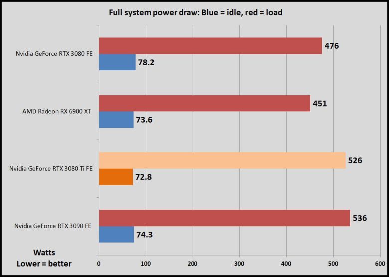 RTX 3090과 유사한 성능은 RTX 3090과 유사한 전력 소비를 의미하기도 한다. 다른 엔비디아 엠퍼러 GPU와 마찬가지로 RTX 3080 Ti는 엄청난 양의 전력을 소비하는 데, 이는 엄청난 대역폭을 제공하는 초고속 GDDR6X 메모리의 높은 에너지 요구 사항 때문이다. AMD의 라데온 RX 6900 XT와 표준 GDDR6 메모리는 비 Ti 3080보다 훨씬 적은 전력을 소비한다.