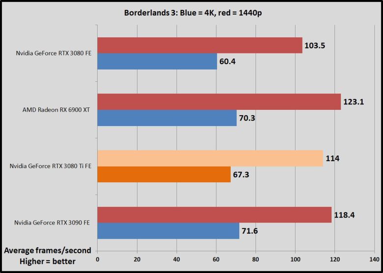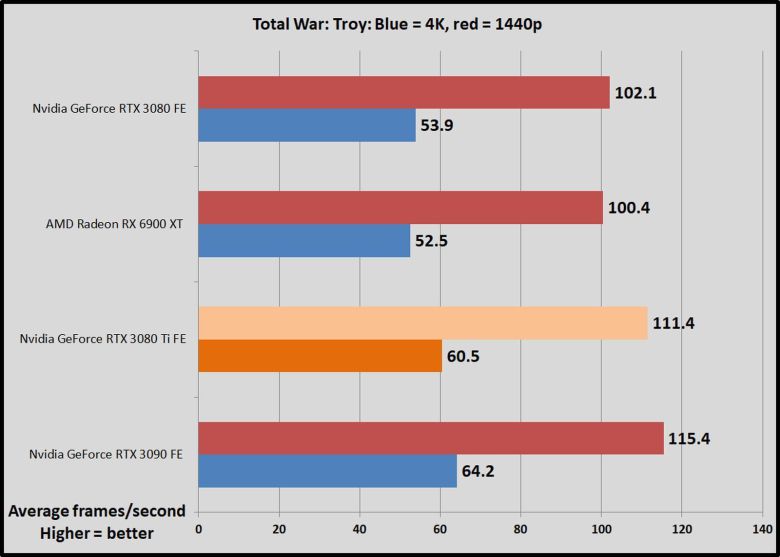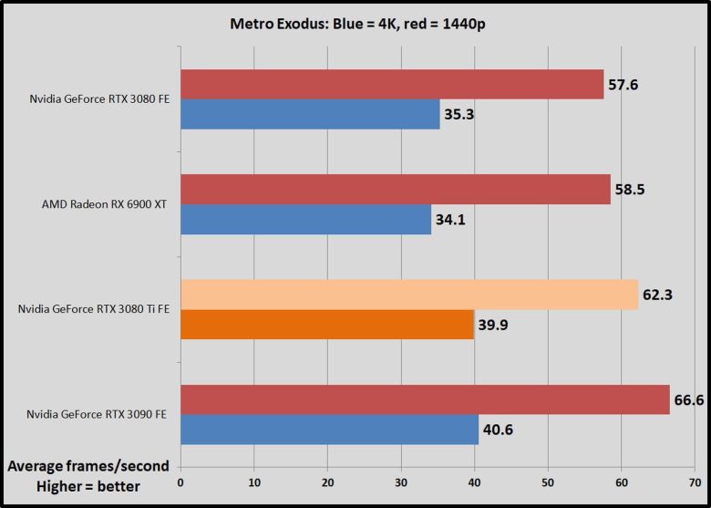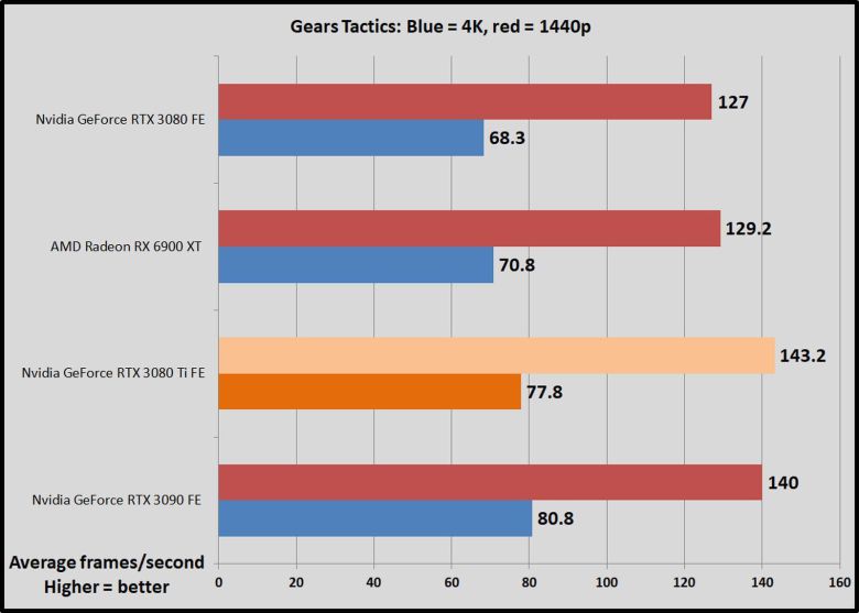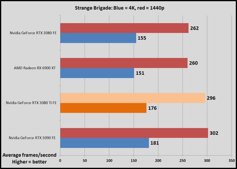 1,200달러짜리 지포스 RTX 3080 Ti를 엔비디아의 FE 모델인 1,500달러 RTX 3090 및 700달러 RTX 3080과 AMD의 경쟁 제품인 라데온 RX 6900 XT(1,000달러)와 비교했다.