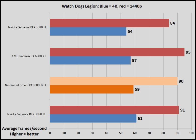 - 와치독스: 리전 와치독스: 리전(Watch Dogs : Legion)은 차세대 콘솔로 데뷔한 첫 번째 게임 가운데 하나다. 유비소프트(Ubisoft)는 실시간 레이트레이싱 및 엔비디아의 DLSS와 같은 최첨단 기능을 포함하도록 디스럽트(Disrupt) 엔진을 업그레이드했다. 이번 테스트에서는 이런 효과를 비활성화하지만, 이 게임의 옵션은 고해상도 텍스처 팩을 설치한 고급 하드웨어에서도 여전히 힘든 게임으로 남아있다. 울트라 그래픽 옵션을 활성화하면 초당 평균 60프레임을 유지할 수 있는 카드는 거의 없으며, 게임은 1440p에서도 8GB 이상의 메모리를 할당한다.