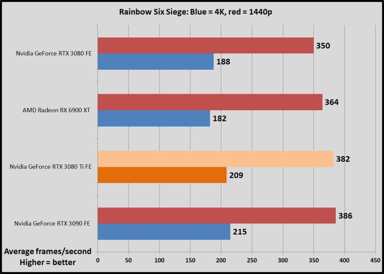 레인보우 식스 시즈(Rainbow Six Siege)는 출시 된 지 몇 년이 지난 후에도 여전히 스팀(Steam) 차트를 지배하고 있으며, 유비소프트(Ubisoft)는 이를 빈번한 업데이트와 이벤트로 지원하고 있다. 개발자들은 수년에 걸쳐 게임의 엔빌넥스트(AnvilNext) 엔진에 엄청난 양의 작업을 쏟아부었고, 결국 테스트에 사용하는 불칸 버전의 게임을 출시했다. 기본적으로 이 게임은 프레임 속도를 높이기 위해 렌더링 배율을 낮추지만 그래픽 카드의 기본 렌더링 성능을 벤치마크하기 위해 100%로 설정했다. 그럼에도 프레임 속도는 급증했다.
