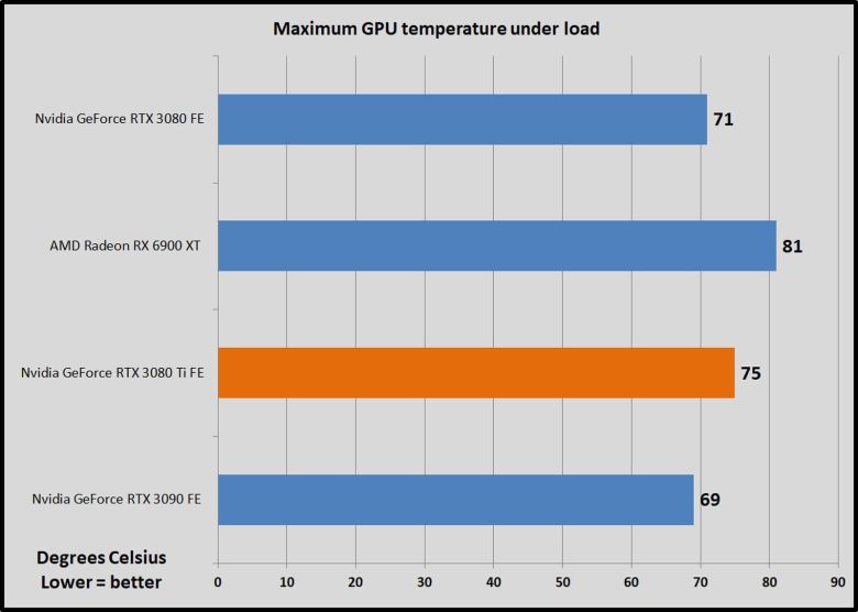 엔비디아의 급진적인 새로운 쿨러는 여전히 매우 좋은 경험을 제공한다. AMD의 표준 트리플 팬 레퍼런스 카드는 몇 도 더 뜨겨워진다. 그러나 듀얼 슬롯 디자인을 선택하면 3080 Ti FE는 RTX 30 제품군의 다른 고급 제품보다 냉각 측면에서 효율성이 떨어진다.