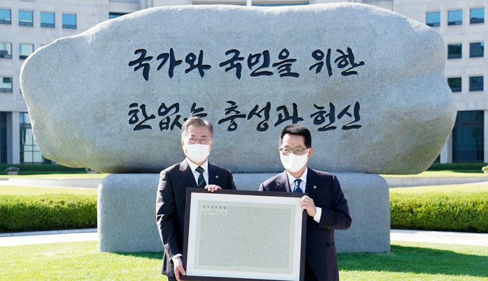 국정원은 4일 문재인 대통령이 참석한 가운데 원훈석(院訓石) 제막식을 열고 ‘국가와 국민을 위한 한없는 충성과 헌신’이라는 새 원훈을 공개했다. 박근혜 정부 당시인 2016년 ‘소리 없는 헌신, 오직 대한민국 수호와 영광을 위하여’로 원훈을 바꾼 지 5년 만에 다시 교체한 것이다. 문 대통령이 2018년 7월 취임 후 처음으로 국정원을 방문해 “국가와 국민을 위한 한없는 충성과 헌신이 바로 국정원의 본령”이라고 한 데서 따온 문구다.