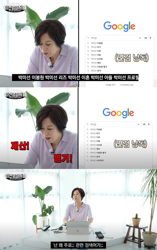 본격적으로 과거 굴욕 사진을 찾기에 나선 박미선은 검색창에 자신의 이름을 넣었다. 그러자 '박미선 이봉원 박미선 리즈 박미선 이혼 박미선 아들 박미선 프로필 재산 별거' 등의 연관 검색어가 나왔고, 박미선은 차례대로 읽으며 확인했다.