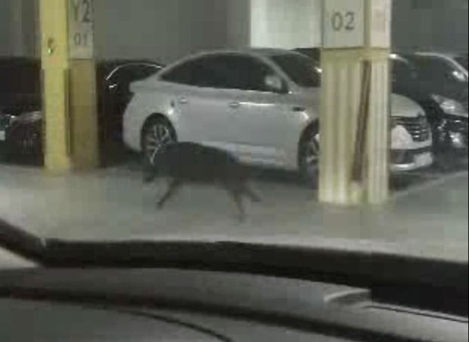 부산 강서구 명지신도시 아파트 주차장에 출몰한 멧돼지. 부산 강서경찰서 제공