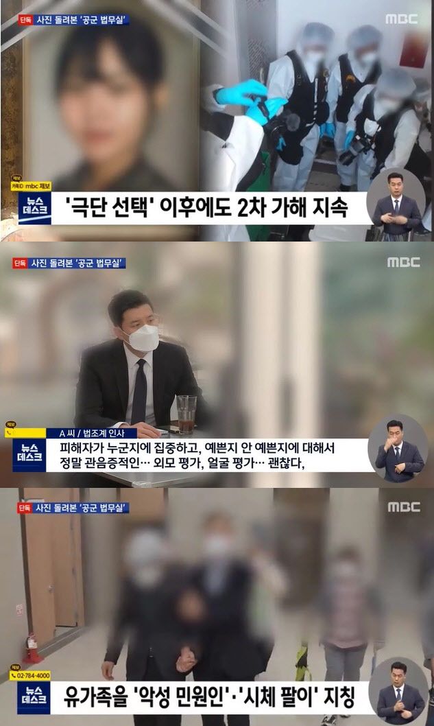 매체는 이 중사가 고통 속에 정신과 치료까지 받던 그때 공군 본부의 법무실에는 이미, 이 중사의 사진과 신상 같은 개인 정보가 돌았고 ‘외모 평가’와 유족을 이른바 ‘진상’이라며 비하했다는 증언이 나왔다고 보도했다.