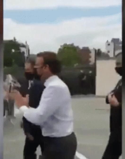 8일(현지시간) AFP통신에 따르면 마크롱 대통령이 프랑스 남동부 드롬 지역의 한 고등학교 방문 후 차에 타려다 자신을 부르는 구경꾼들의 소리에 구경꾼들에게 다가간 오후에 발생했다.