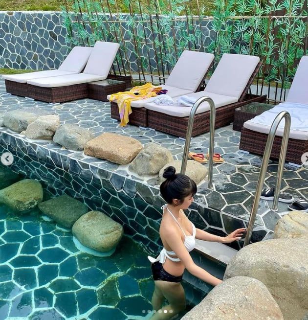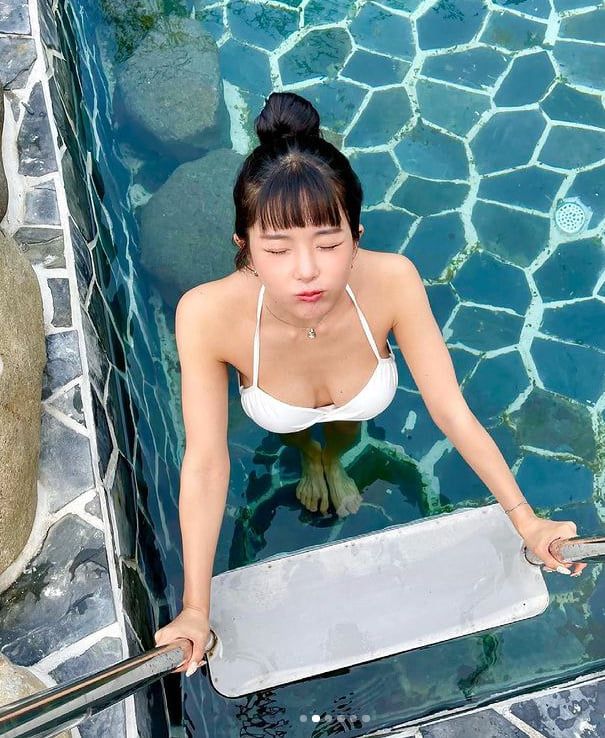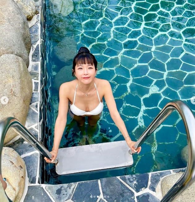 공개된 사진에는 비키니를 착용한 채 수영장에서 인증샷을 남기고 있다.