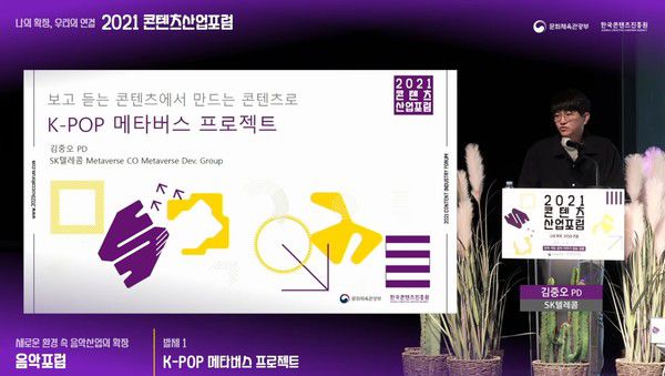 김중오 SK텔레콤 PD가 '2021 콘텐츠산업포럼'에서 발표하고 있다. / 사진=한국콘텐츠진흥원 유튜브 캡쳐