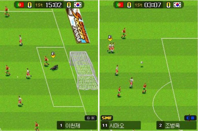 사실 피처폰의 환경상 축구 게임을 부드럽게 하기 어려운데, 조작모드도 쉽고 부드러운 드리블에 적합한 4방향 키조작 모드와 다양한 기능 연출에 적합한 8방향키 조작 모드, 2가지로 취향에 따라 선택할 수 있도록 해서 접근성을 높였죠.