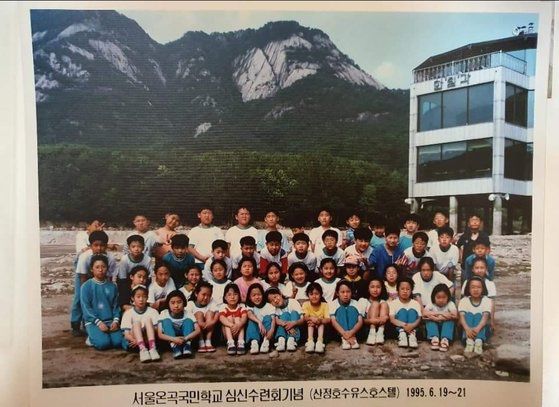 이준석 국민의힘 대표가 지난 1995년 서울 노원구 상계동의 온곡초등학교에 재학 중일 때 수학여행에서의 단체 사진. 세 번째 줄, 오른쪽에서 두 번째에 하얀 옷을 입고 있는 게 이 대표다. |