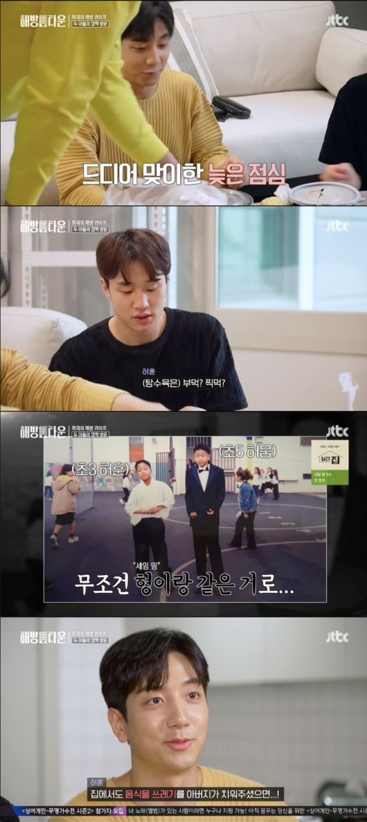 배달음식을 시킨 삼부자. 허훈은 “부먹? 찍먹?”물었고, 허재는 “나도 찍먹. 찍먹으로 하자”라고 말했다. 짜장면과 탕수육을 먹으며 허재는 “어떻게 이렇게 올 생각을 하냐. 기특하다”라며 형제에게 말했다.