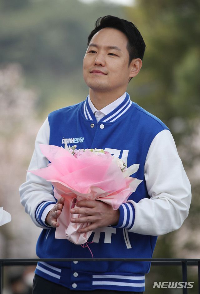 [서울=뉴시스] 김진아 기자 = 김한규 신임 정무비서관이 지난해 4월 총선 당시 유세를 하고 있는 모습. 2020.04.11. bluesoda@newsis.com |
