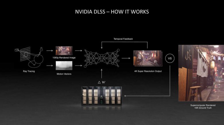 딥 러닝 슈퍼 샘플링의 약자인 DLSS는 엔비디아 2000, 3000 시리즈 GPU에서 AI 텐서 코어를 사용해 저해상도에서 게임을 렌더링한 후 해상도를 높여도 시각 효과를 손실 없이 표현하는 기술이다. 완성도가 높아져 최신 제품에서는 마치 흑마법처럼 작동한다.