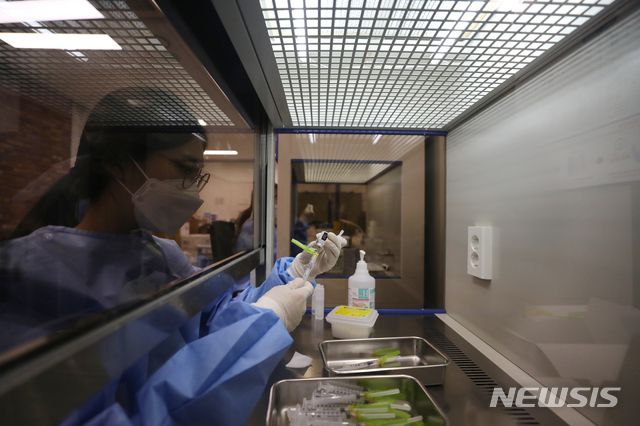 [서울=뉴시스]정병혁 기자 = 7일 오전 서울 동작구 사당종합체육관에 마련된 예방접종센터에서 의료진이 화이자 백신을 소분하고 있다. jhope@newsis.com |