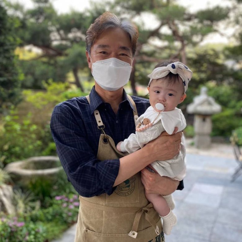 사진에서 정보석은 예쁜 옷을 입은 손녀를 안은 채 카메라를 바라보고 있다.