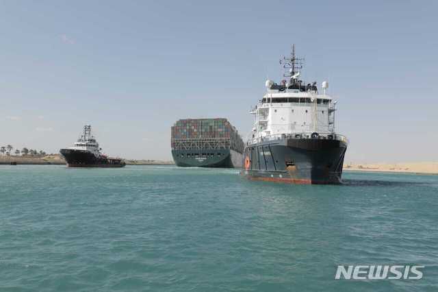 [수에즈운하=AP/뉴시스]이집트 수에즈운하에서 엿새간 좌초됐던 파나마 국적 화물선 에버 기븐(가운데)호가 지난 3월29일(현지시간) 예인선에 이끌려 나오고 있다. 2021.06.24 |