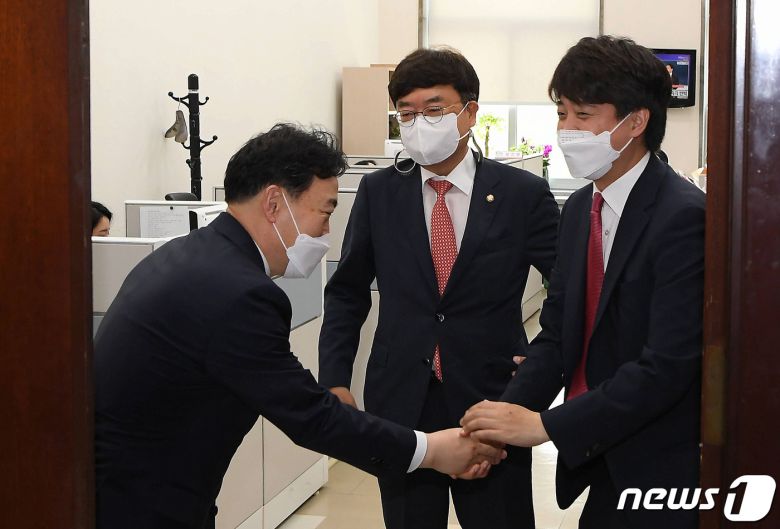 김오수 검찰총장(왼쪽)이 24일 서울 여의도 국회에서 이준석 국민의힘 대표를 예방한 후 악수를 나누고 있다. 2021.6.24/뉴스1 © News1 이동해 기자 |