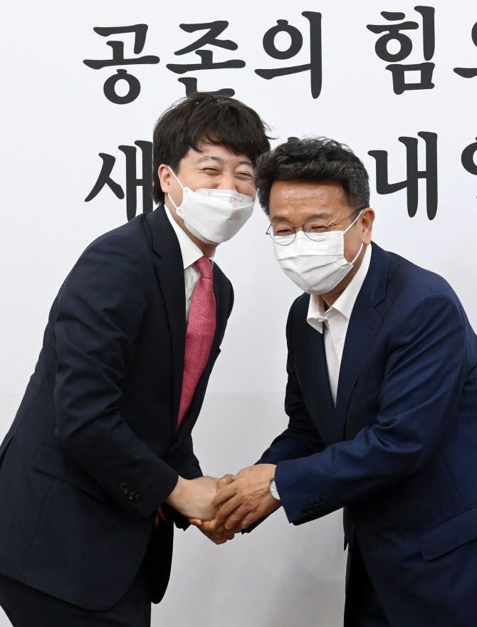 지난 16일 서울 여의도 국회에서 이철희 청와대 정무수석(오른쪽)이 이준석 국민의힘 대표를 예방해 인사를 나누고 있다 (사진=연합뉴스) |