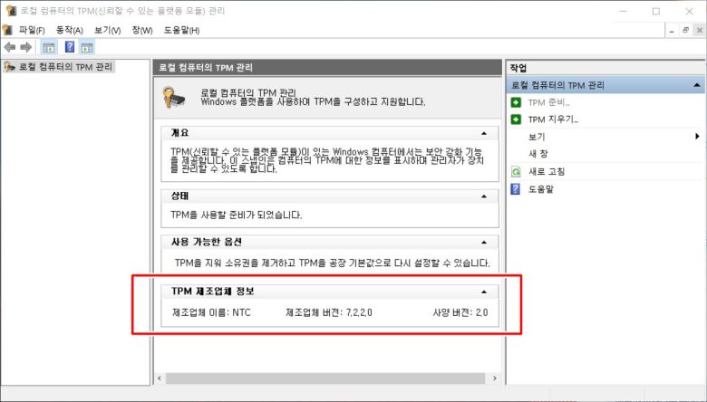 우선, PC에 TPM 칩이 있는지는 바로 확인할 수 있다. 윈도우 10 PC의 검색 창에 tpm.msc를 입력하면 TPM 관리 앱이 실행되는데, 맨 아래에서 TPM 제조업체와 버전을 확인하고, TPM이 설치되어 있는지, TPM 인증을 받았는지를 확인할 수 있다.