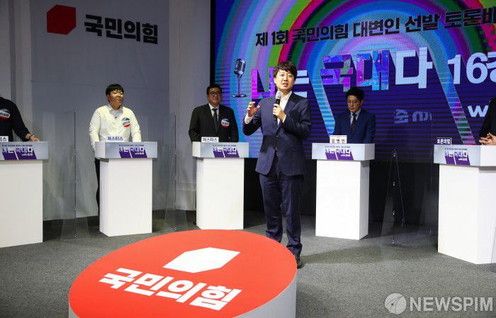 [서울=뉴스핌] 국회사진취재단 = 국민의힘 이준석 대표가 27일 오후 서울 영등포구 더플러스 스튜디오에서 열린 '제1회 국민의힘 대변인 선발 토론배틀-나는 국대다! with 준스톤' 16강 오디션에서 인사말을 하고 있다. 2021.06.27 photo@newspim.com