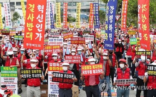 (세종=연합뉴스) 김주형 기자 = 전국 시설물유지관리사업자와 종사자들이 지난 7월 15일 오후 세종시 정부세종청사 국토교통부 앞에서 '시설물유지관리업종 폐지 반대'를 촉구하는 집회를 열고 있다. 2020.7.15 kjhpress@yna.co.kr