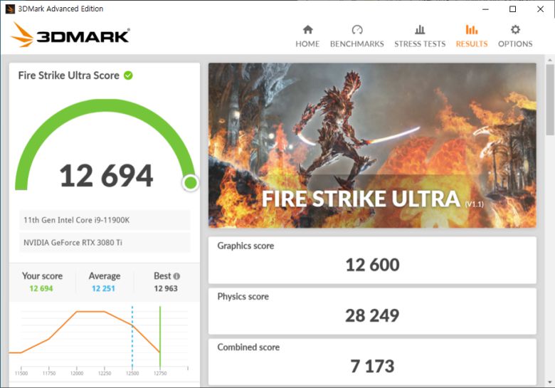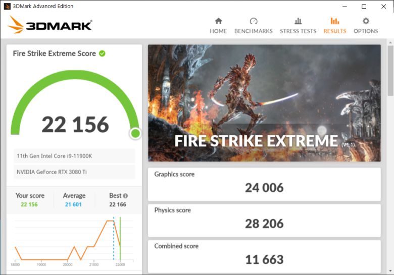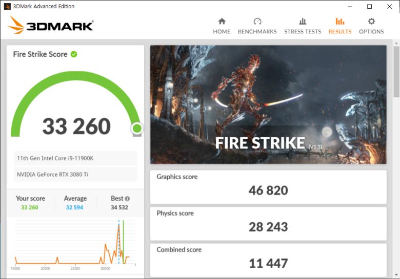 3D마크 파이어 스트라이크 벤치마크 결과이다. 파이어 스트라이크의 그래픽 스코어는 46,820점, 파이어 스트라이크 익스트림의 그래픽 스코어는 24,006점, 파이어 스트라이크 울트라의 그래픽 스코어는 12,600점으로 측정되었다. |